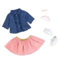 - Includes: doll, frilly denim-style top, tulle skirt with a shimmering gold waistband, a pair of undies, shoes with real laces, a pair of glasses, and a hair bow.