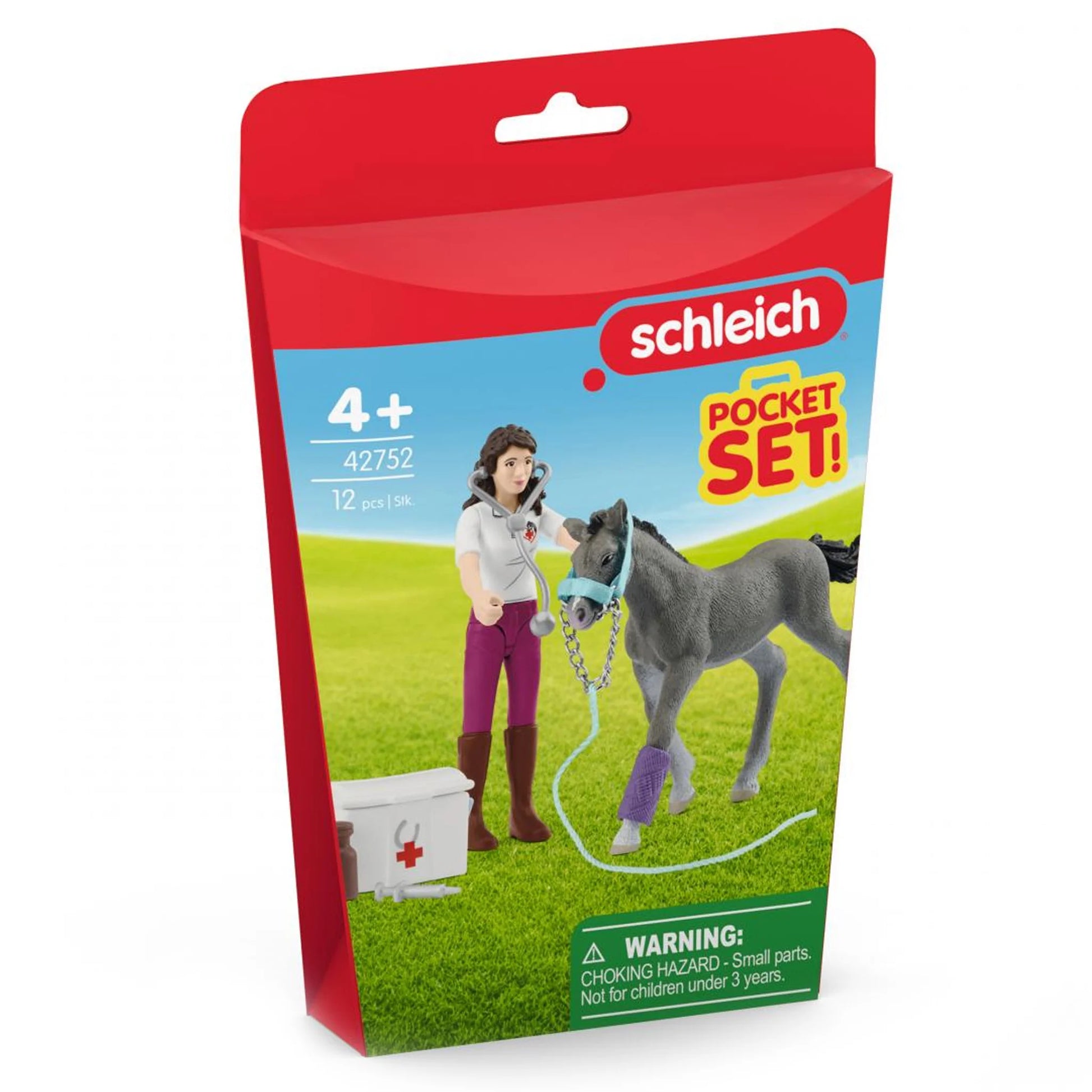 Contents: 1x Mrs. Kramer figure, 1x Trakehner foal, 1x grooming box, 1x medicine bottle, 1x syringe, 1x stethoscope, 1x adhesive bandage, 1x halter.